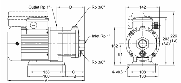 水平多段離心式泵浦,泵浦與馬達同 軸,葉輪固定於加長之馬達軸心上,主要動作 部位零件為不銹鋼材質。