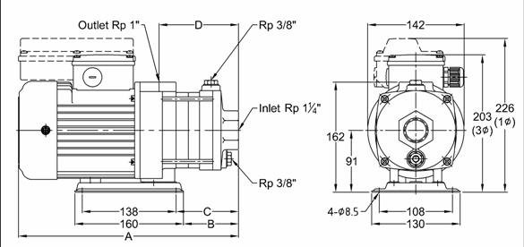 水平多段離心式泵浦,泵浦與馬達同 軸,葉輪固定於加長之馬達軸心上,主要動作 部位零件為不銹鋼材質。