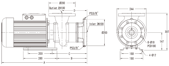 TPM為水平多段式離心泵浦,非自吸式,泵與馬達同軸設計,配用機械軸封,