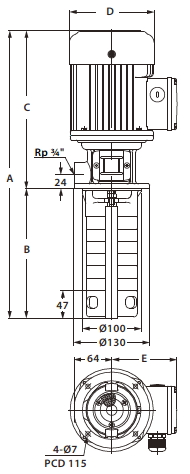 直立多段離心式泵浦,浸水式,泵浦與馬達同軸,主要動作部位零件為不銹鋼材質。