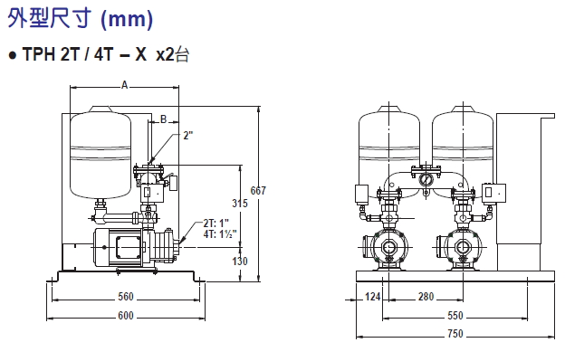 | TPH4T5KXx2 | 2x2 | 1Ø | 220V | 4.5 | 5.5 | 4 | 1½ | 2 | 64 | 360 |