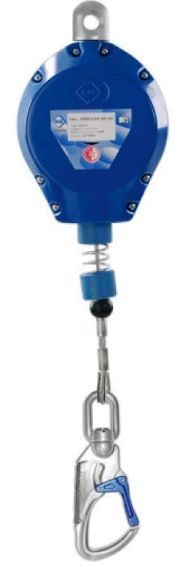 特性: 本防墜器具有萬一墜落時可瞬間鎖定功能,衝擊能量抵銷致傷害減少。並且具自動 伸縮回捲裝置設計,輕巧方便攜帶。
