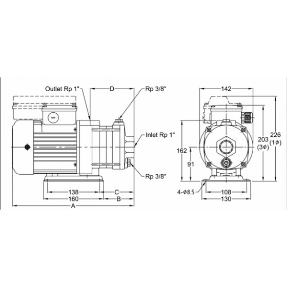 水平多段離心式泵浦,泵浦與馬達同 軸,葉輪固定於加長之馬達軸心上,主要動作 部位零件為不銹鋼材質。