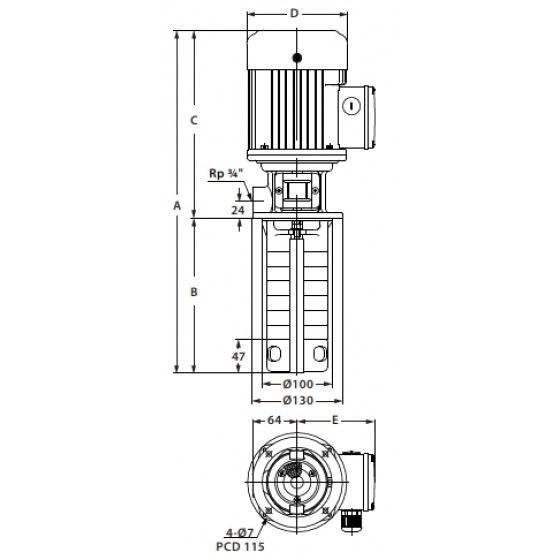 直立多段離心式泵浦,浸水式,泵浦與馬達同軸,主要動作部位零件為不銹鋼材質。