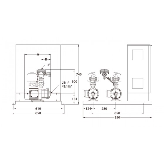 並列運轉 : 使用時單台啟動,隨使用水量增加,單台運轉無法滿足設定之壓力及使用水量時,第二台自行啟動併入運轉補償,隨水量遞減,單台可以滿足設定之壓力及使用水量時,第二台自動停機。