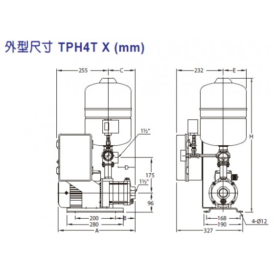 | 型式 | A | B | C | D | E | H | 壓力桶(L) |