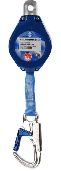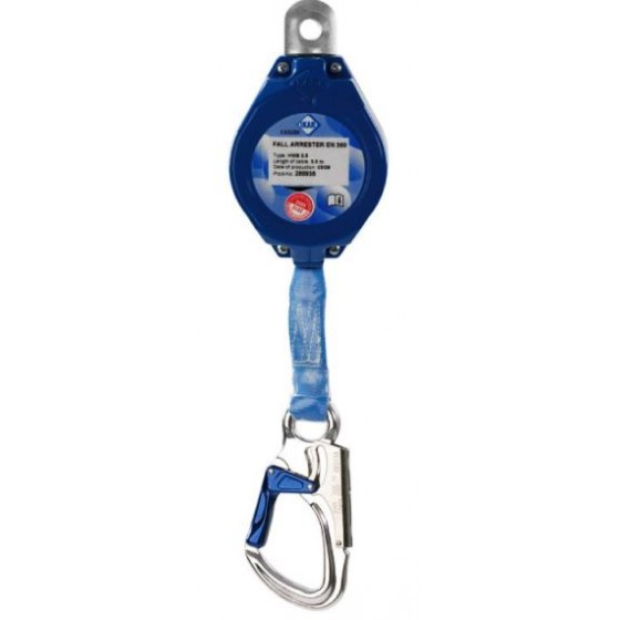 特性: 本防墜器具有萬一墜落時可瞬間鎖定功能,衝擊能量抵銷致傷害減少。並且具自動 伸縮回捲裝置設計,輕巧方便攜帶。