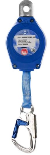 特性: 本防墜器具有萬一墜落時可瞬間鎖定功能,衝擊能量抵銷致傷害減少。並且具自動 伸縮回捲裝置設計,輕巧方便攜帶。